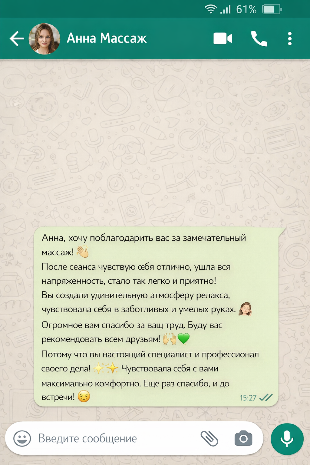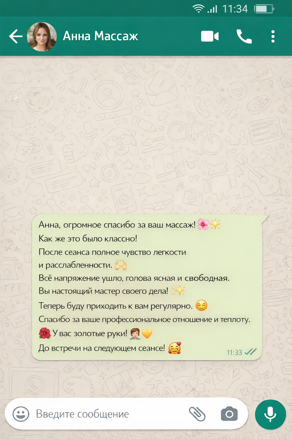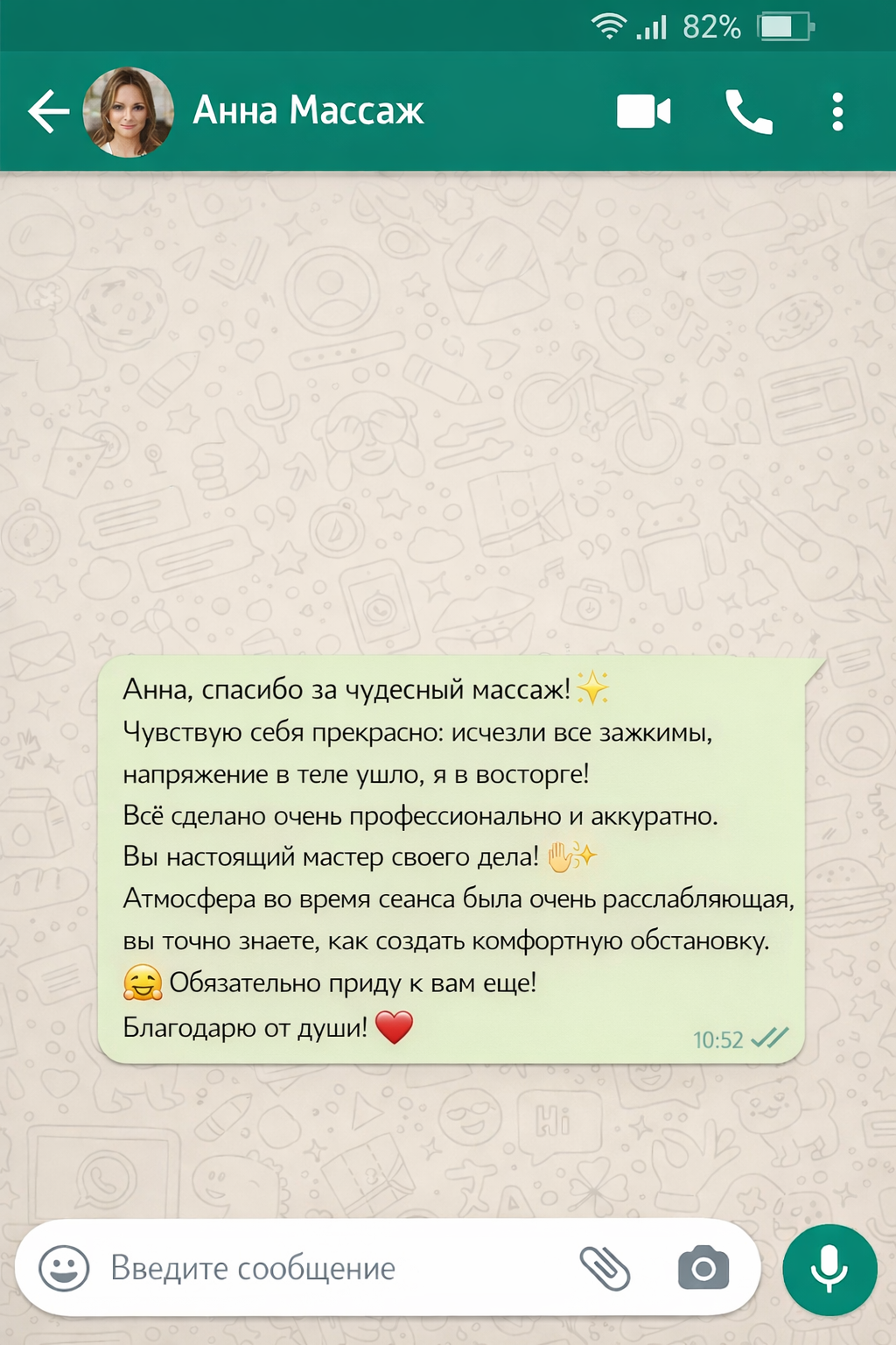 Массаж — это не просто процедура, а возможность почувствовать заботу о себе, восстановить силы и наполниться энергией. Если вы хотите расслабиться, избавиться от усталости или поддержать здоровье, буду рада помочь вам на пути к лучшему состоянию.