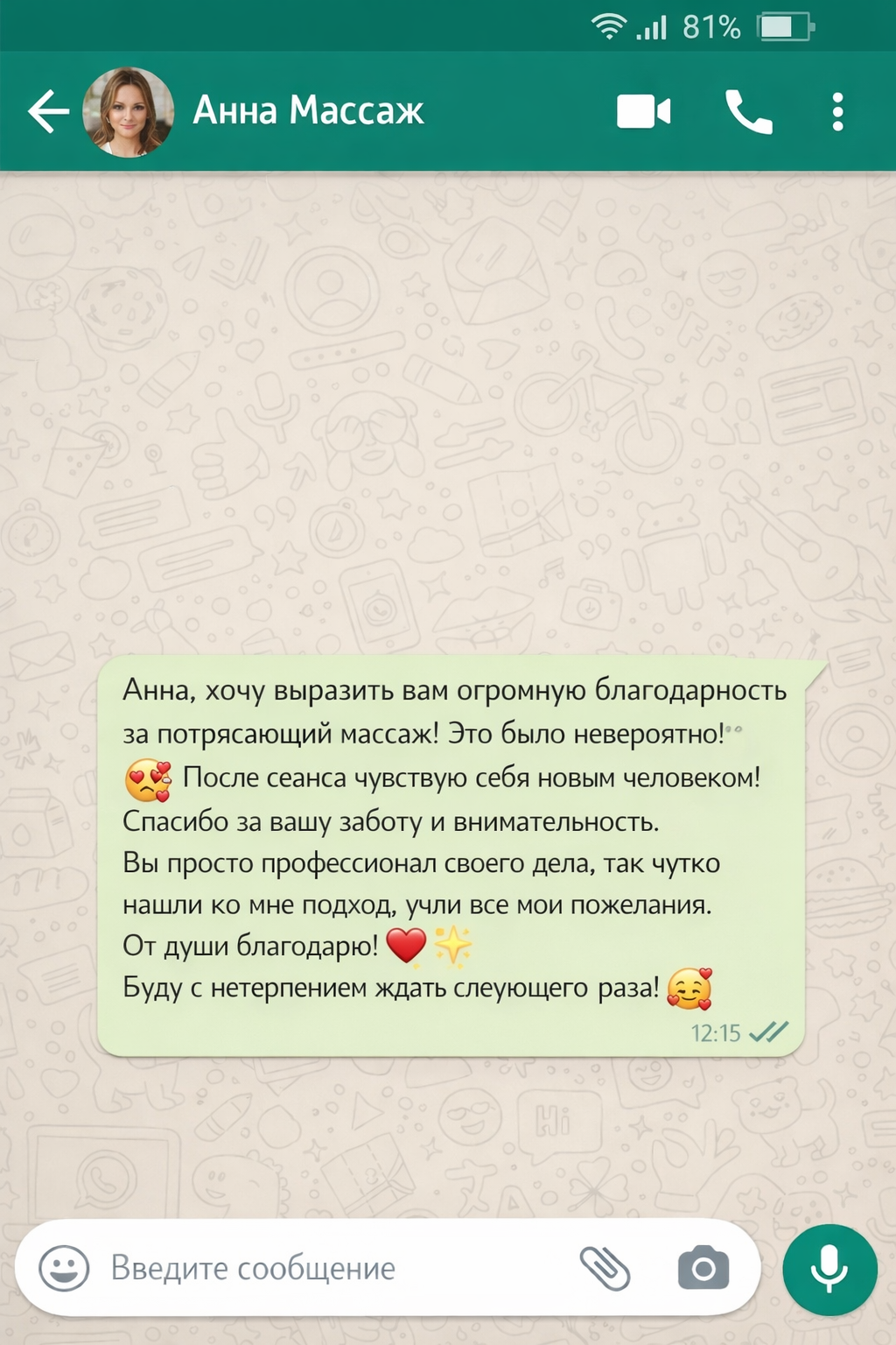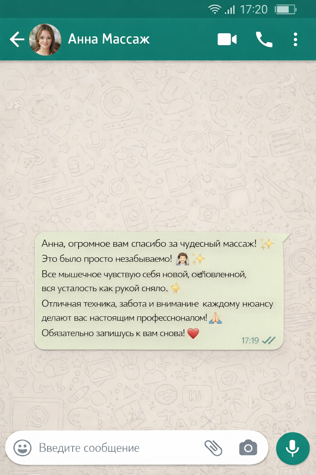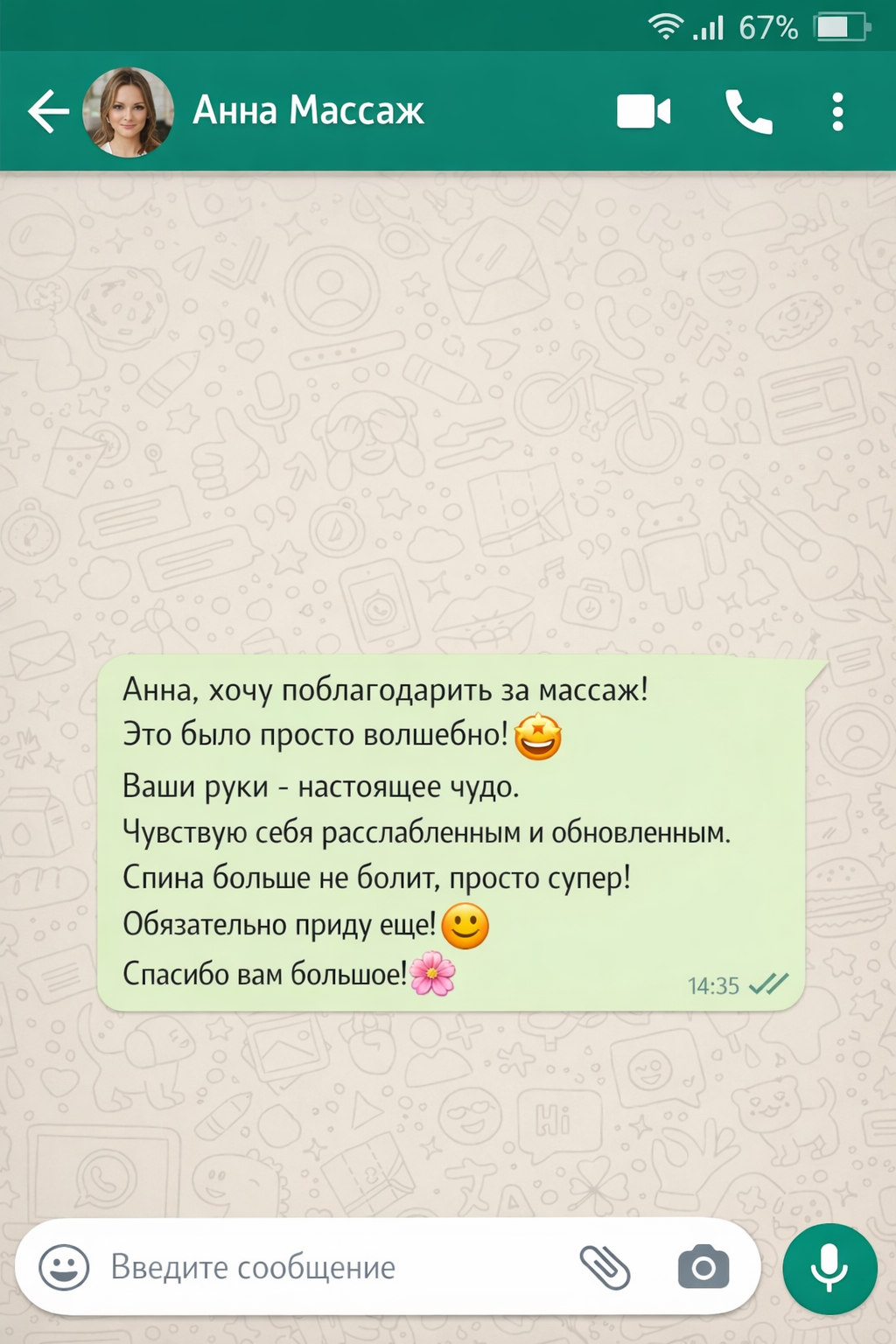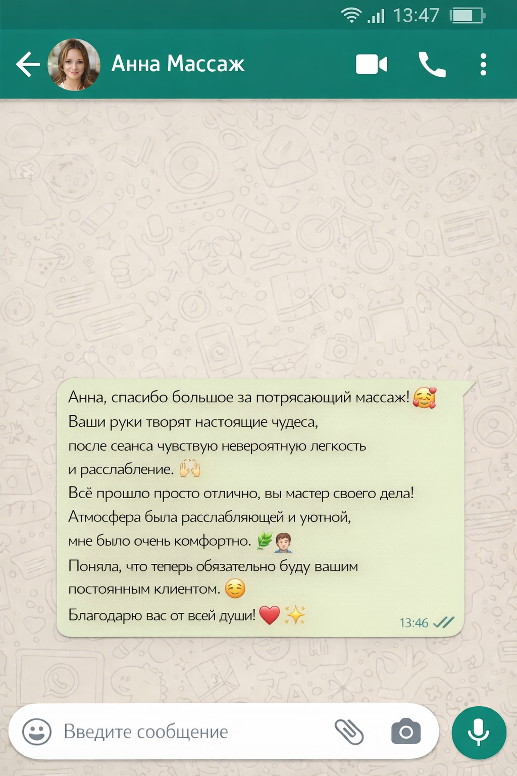 Массаж — это не просто процедура, а возможность почувствовать заботу о себе, восстановить силы и наполниться энергией. Если вы хотите расслабиться, избавиться от усталости или поддержать здоровье, буду рада помочь вам на пути к лучшему состоянию.